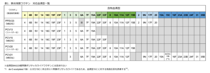 | 略号 | PCV21 | PCV20 | PCV15 | PPSV23 | |