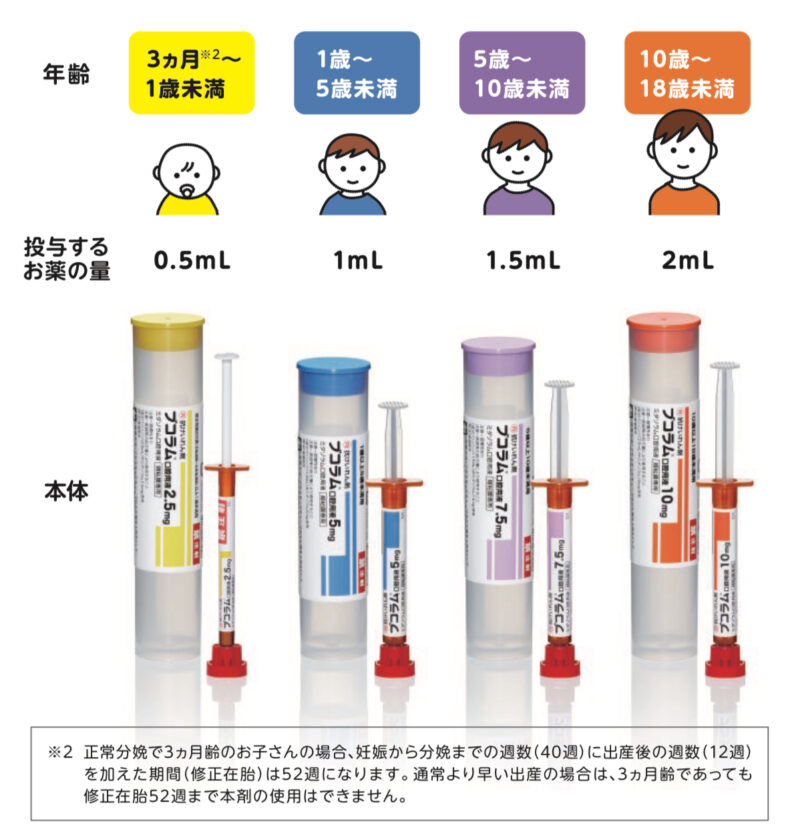 | 投与量 | 年齢と体重で判断 4パターン(5/10/15/20mg) 6歳未満の小児の1回量は15mgを超えないこと | 年齢で判断 4パターン(2.5/5/7.5/10mg) |