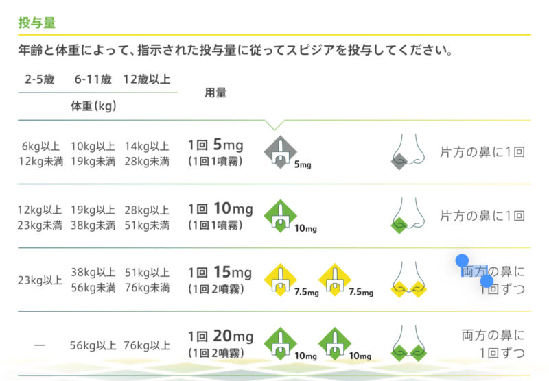 2歳以上6歳未満の小児に投与する場合は、患者の状態を観察することができ、必要時に救急蘇生のための医療機器、薬剤等の使用が可能な医師の監視下においてのみ行うこと(スピジア点鼻液、電子添文)